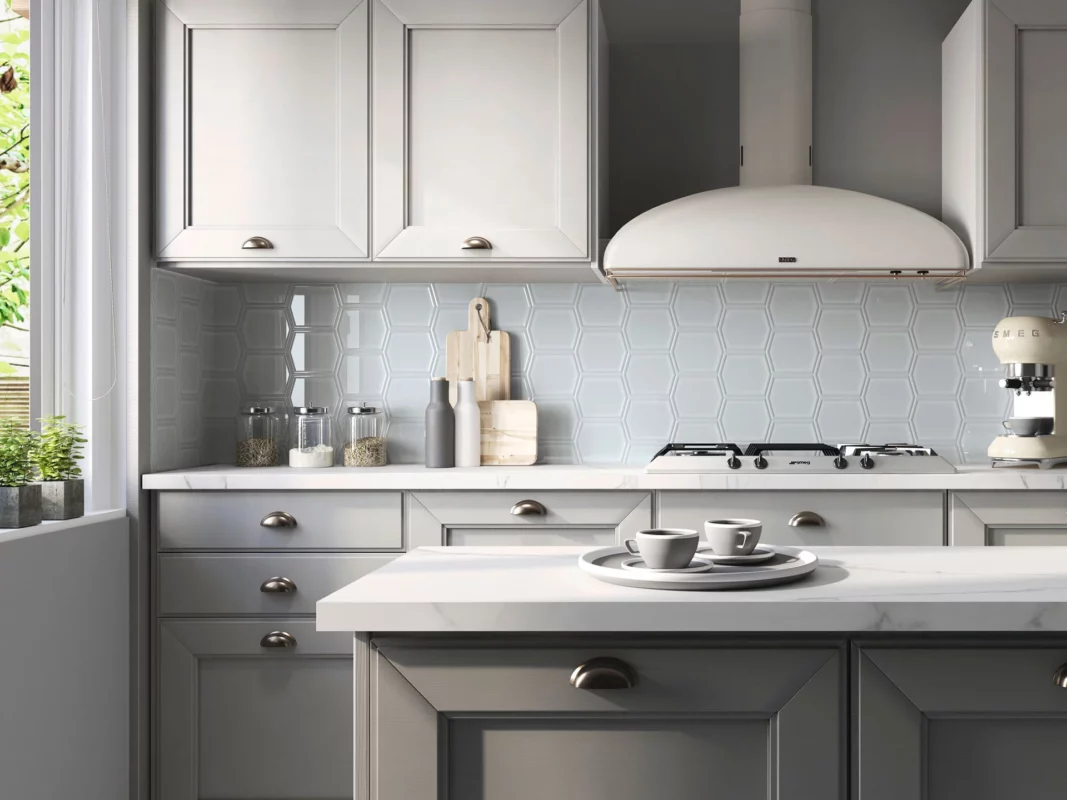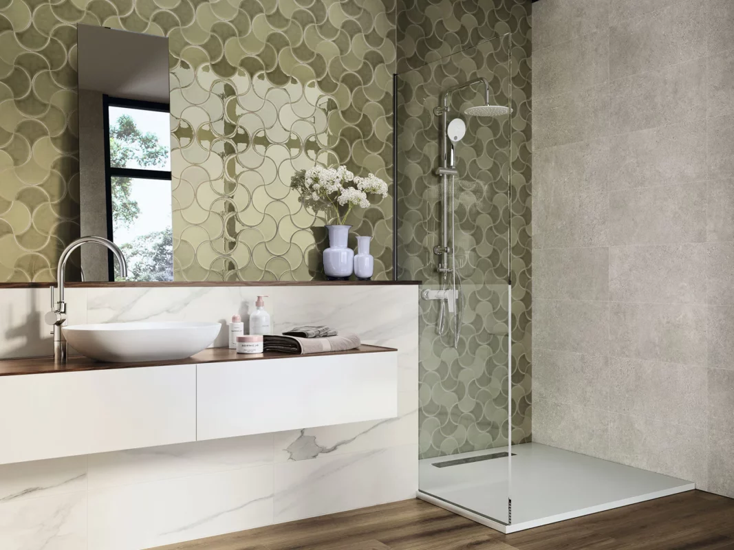 Una de las grandes tendencias cerámica 2025 es la combinación de formatos orgánicos y modulares. En revestimientos verticales, los azulejos pequeños en forma de escama, hexágonos y relieves geométricos marcan la diferencia. Estos patrones crean juegos de luz y sombra que enriquecen visualmente las superficies.